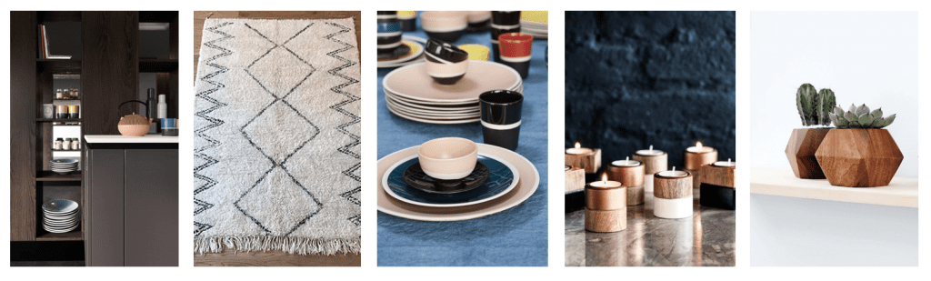 Photo n°1 : Modèle Reflet, Arthur Bonnet ; Photo n°2 : Tapis inspiration berbère, Berni Ouarain ; Photo n°3 : Collection Sicilia, Maison Sarah Lavoine ; Photo n°4 : Bougeoirs cuivre et bois, H&M Home ; Photo n°5 : Adia Planter, The-citizenry.com