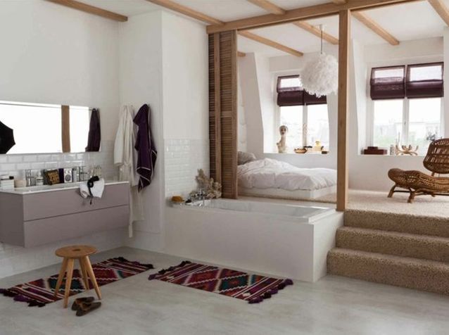 La chambre peut être au centre de la pièce, adossée à la salle de bain, elle aussi centrale. Cet agencement apporte de l’originalité et vous permet d’occuper la longueur des murs pour des placards et votre dressing. Le dressing peut également être adossé au lit, séparé par un mur ou une cloison. La partie chambre sera réalisée d’une manière simple, avec la décoration et le type de lit que vous aurez choisi. L’ameublement pourra être simplement fait d’une tête de lit et de deux tables de chevet.